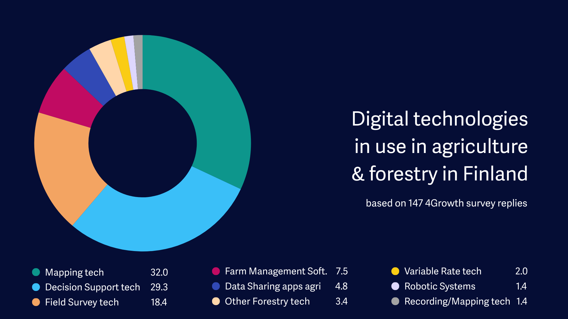 Early results show that digital adoption in Finnish forestry centres on three main technology categories: mapping technologies (32%, N=47), decision-support tools (29%, N=43), and field survey technologies (18%, N=27). Together, these tools enable core forestry activities that rely on spatial analysis, long-term planning and accurate in-field data collection.